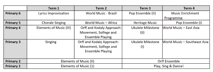 The music curriculum is anchored on creating direct experiences in Listening and Responding, Creating and Performing Music. It is through these music-making activities, at the end of six years of music education, students develop