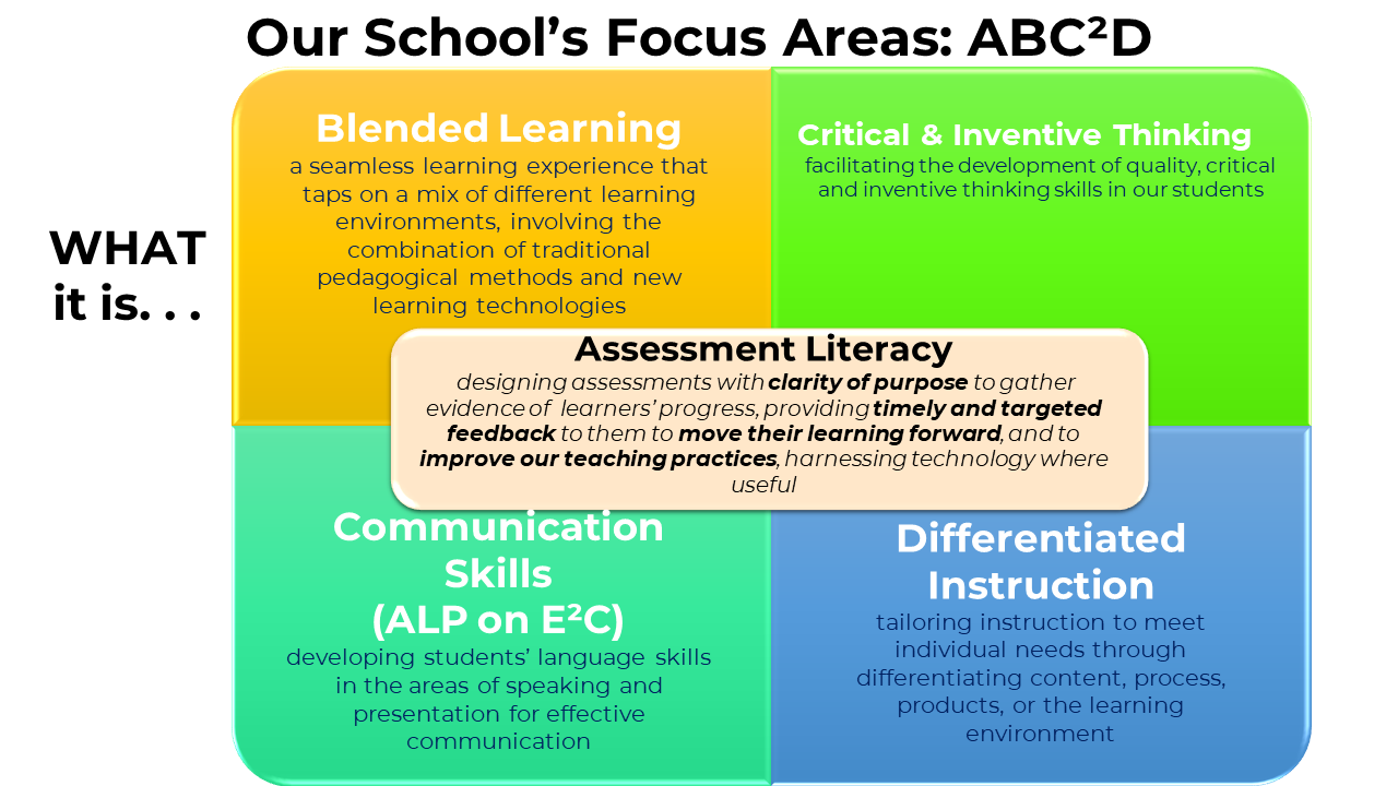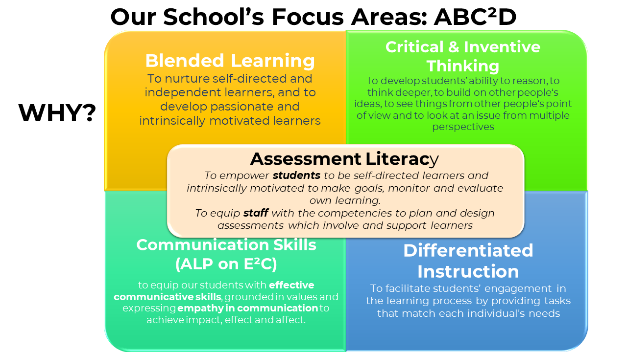 The school is committed to prepare our students to be Future Ready by employing our innovative ABC2D approach. This approach encapsulates Assessment Literacy, Blended Learning, Critical and Inventive Thinking (CIT), Effective and Empathetic Communication to cater to the 21st Century Competencies, and Differentiation in the classroom to ensure no child is left behind. This comprehensive strategy ensures that every student is included and catered to, fostering critical, inventive skills. Students also need to embrace adaptive thinking, sizing up unexpected situations, considering possible options and deciding on the best solution. Therefore, the school not only focuses on academic prowess but also prepares students to adapt and respond to unforeseen challenges effectively.