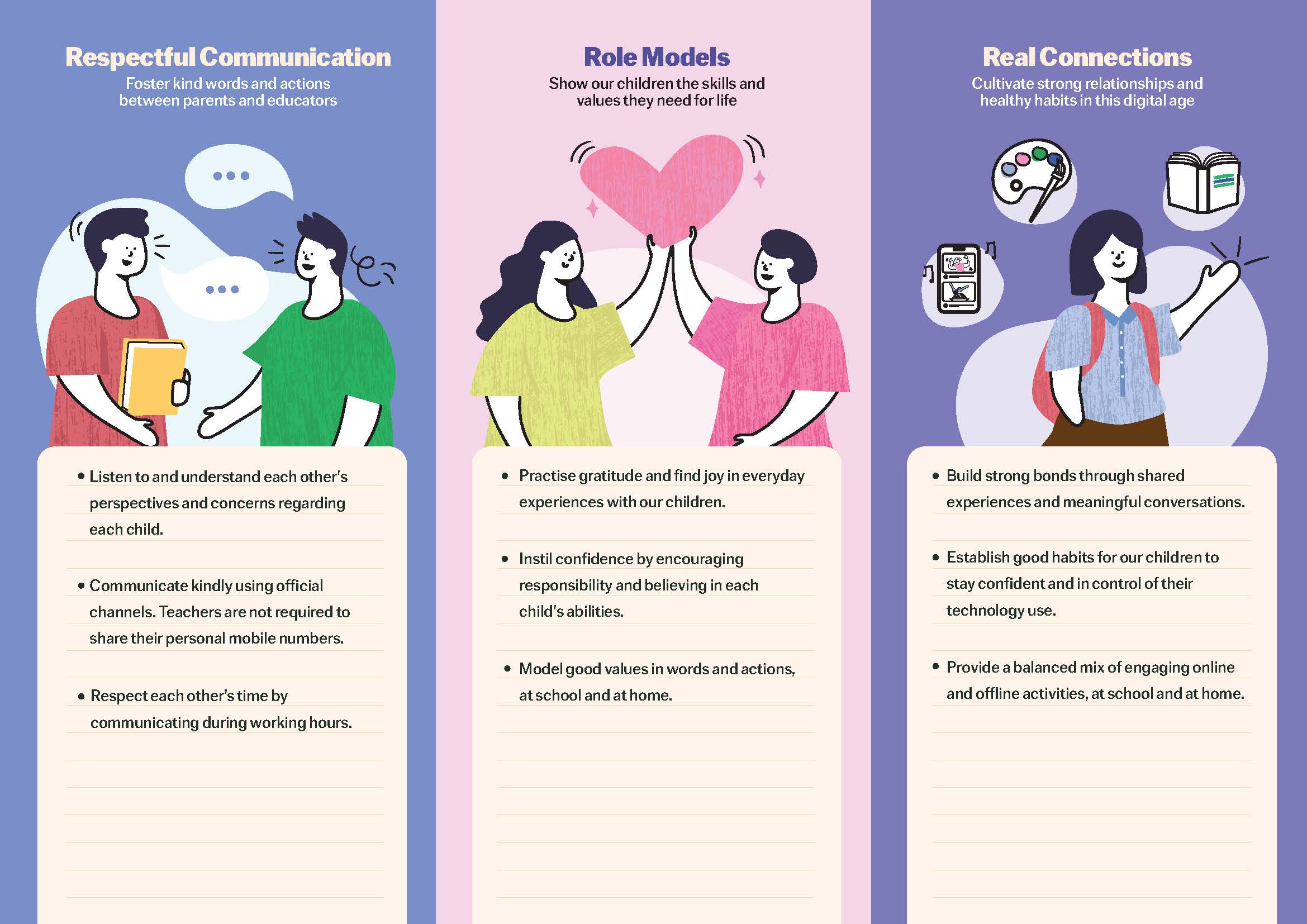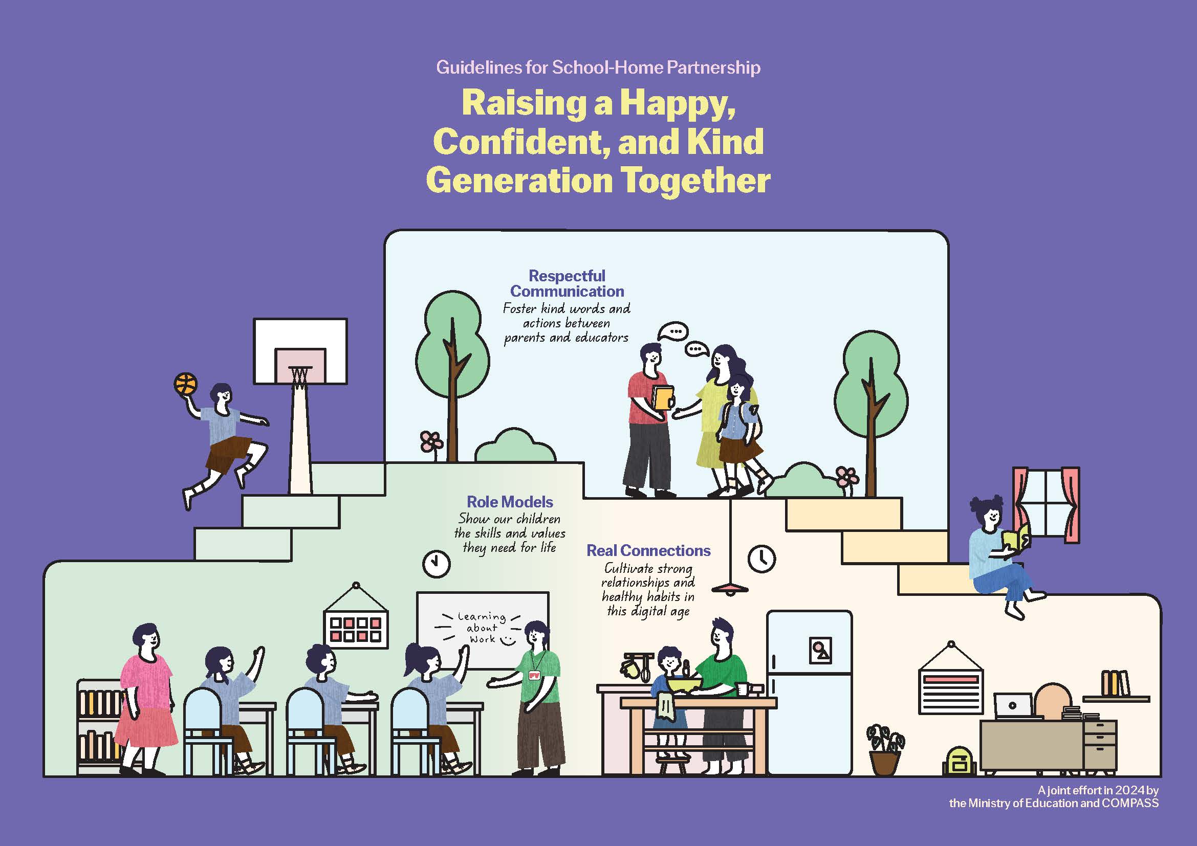 The Ministry of Education (MOE) has released a refreshed set of guidelines on the development of positive school-home partnerships. The previous guideline was initially released in 2019. The new School-Home Partnership Guidelines is a joint effort by COMPASS (COMmunity and PArents in Support of Schools) and Ministry of Education, Singapore (MOE). The refreshed guideline places our common desired outcomes at the centre so that both parents and schools will raise a HAPPY, CONFIDENT and KIND generation together.
